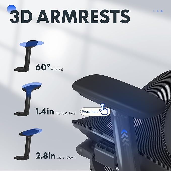 - 3D Armrests: Fully adjustable armrests (height, forward/back, and swivel) allow for precise positioning to reduce arm strain during extended use.