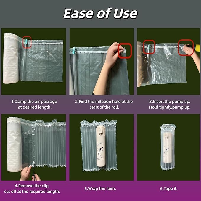 - 【Method of use】:These shipping air pillows comes with a hand pump for easy inflation. No air cushion machine needed. Locate the inflation hole located at the collar of the packing pillows. The green arrow indicates the direction of airflow. Clamp the other end of the packing roll to the desired length with a binder clip. Do not over-inflate the film, as this may cause perforation (please refer to the instruction chart for details on how to use the film)