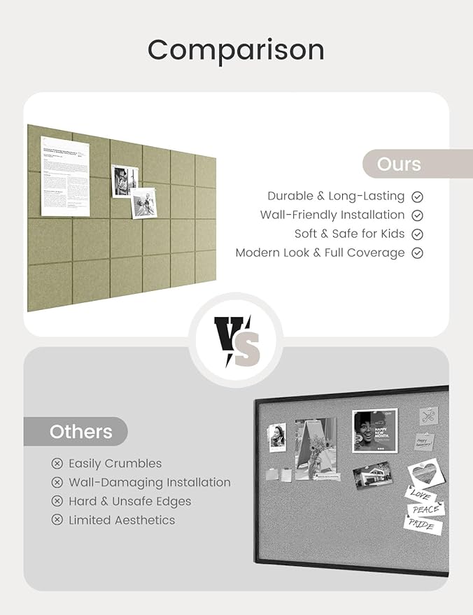 - 【Felt Bulletin Board – 6 Tiles Included】 Includes 6 felt cork boards (each 11.8" x 11.8") with 30 Pushpins that can be freely arranged into a large display board. Perfect for showcasing your schedules, ideas, and creations in home or office settings.
