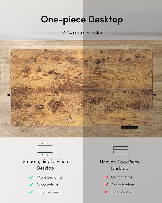 - Seamless One-Piece Design: Fezibo adjustable standing desk features a smooth, one-piece desk surface without visible seams. Unlike other models with joined panels, this seamless design offers 30% enhanced stability to provide a solid foundation for your equipment.