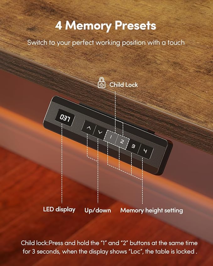 - 4 Memory Height Presets: The Fezibo Electric Standing desk features an intuitive LED controller for quiet operation. It allows you to save up to 4 custom height settings to seamlessly switch between your preferred heights, ensuring you have a focused, distraction-free workspace.