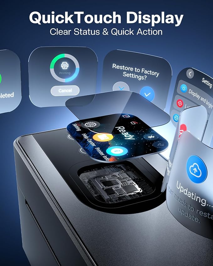 - [Innovative Touch Screen Design]- PM64D label printer. This innovative freight thermal printer is equipped with a touch screen, allowing for a more intuitive understanding of the printing status. It also enables one-click factory settings and other operations, making it more convenient and efficient to operate. Not only that, this ultra-compact shipping label printer measures only 6.63 x 3.25 x 2.94 inches, saving 20% more space than other models, maximizing work efficiency while simplifying your workflow