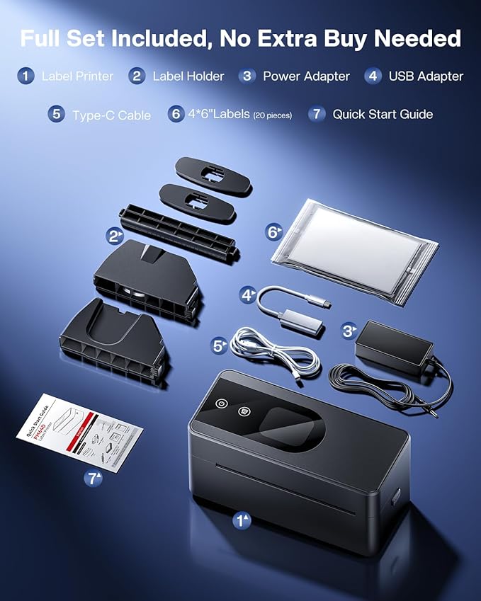 - [No Ink, No Waste thermal technology ] - No need to maintain expensive ink and toner! Our thermal shipping label printer is equipped with a 203DPI print head, achieving clarity while reaching a printing speed of 150mm/s. Intelligent automatic alignment prevents printing errors. There is no doubt that this label printer for small business can significantly reduce your printing costs for small businesses, without worrying about problems such as logistics providers being unable to scan due to blurred printing