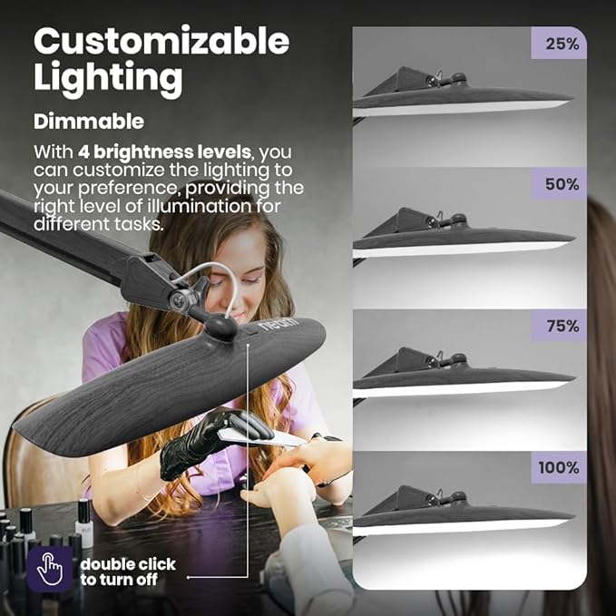 - Professional Lighting – This desk light is designed for professionals, hobbyists, and nail technicians, featuring a 20-inch lamp head with 117 LED SMD lights to illuminate a wide area. Ideal as a clamp-on desk lamp or desk lamp for office use, it provides excellent lighting for extensive work surfaces and tasks like reading, drafting, crafting, painting, sewing, detailed work, and nail art, ensuring every detail is clearly visible and well-lit.