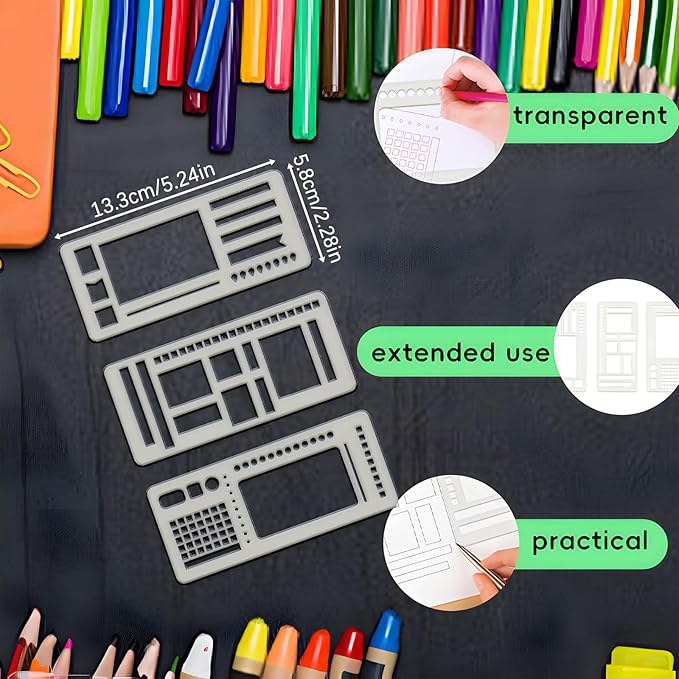 - 【3-in-1 Functional Set】Includes multi-size rectangles for habit trackers or weekly spreads, checkbox templates from mini to large for to-do lists, and guided line rulers with notches for effortless dot-grid alignment