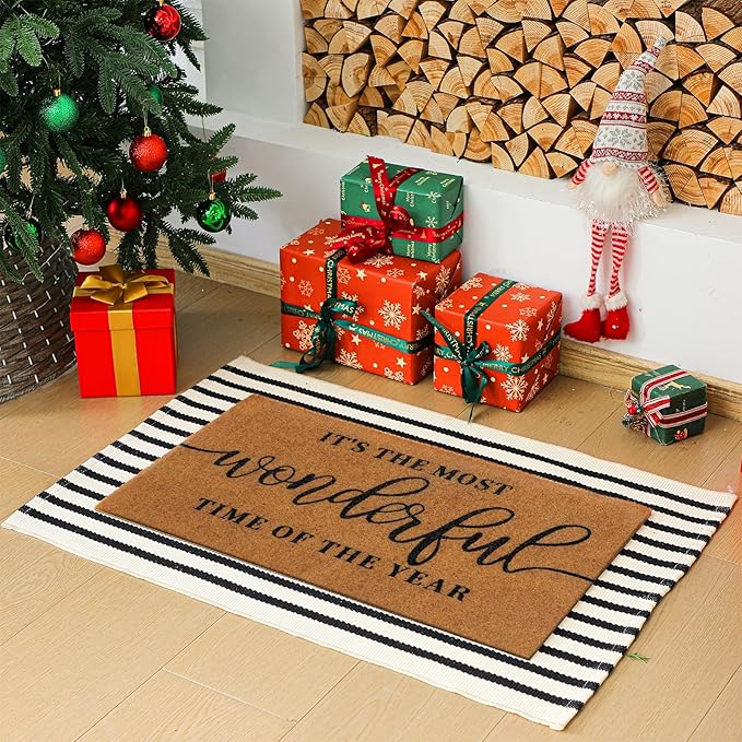 2 Pcs Christmas Coir Welcome Doormat Christmas Rug Outdoor Layered Buffalo Plaid Black and White Mat Stripe Mat for Xmas Front Porch Entryway Outdoor