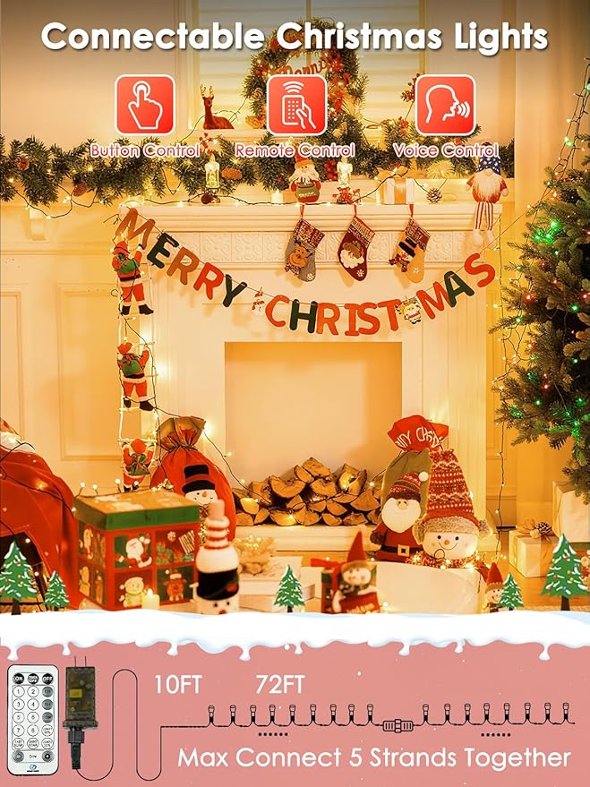 - 【4 Brightness Levels&3 Timer Function】:The twinkle lights for Christmas tree set features 4 brightness settings (25%, 50%, 75%, 100%). Easily adjust the Xmas fairy lights intensity via voice commands or remote control—from dazzling brilliance to soft nightlight—to suit any occasion. Even more thoughtful, the Xmas outdoor string lights come with 3 timer settings. These twinkle Christmas lights save energy while ensuring your festive greetings light up on schedule each night, all while guarding your and your family's peaceful sleep