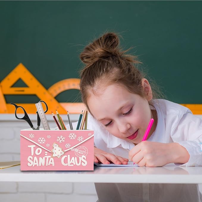 Pink Christmas Winter Pen Holder for Desk, Letter to Santa Claus Wooden Box Sign Desk Decor for Home Office Decoration, Preppy Xmas Pencil Organizer, Pink Christmas Room Decor