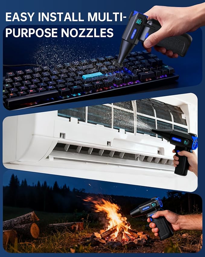 - Value Compressed Air Duster: Beyond a standard air blower, this value-packed set includes 2 specialized nozzles, a soft dusting brush, and a Type-C cable. The handle air blower gun is perfect for keyboards, cameras, car interiors, HVAC filters, and outdoor gear