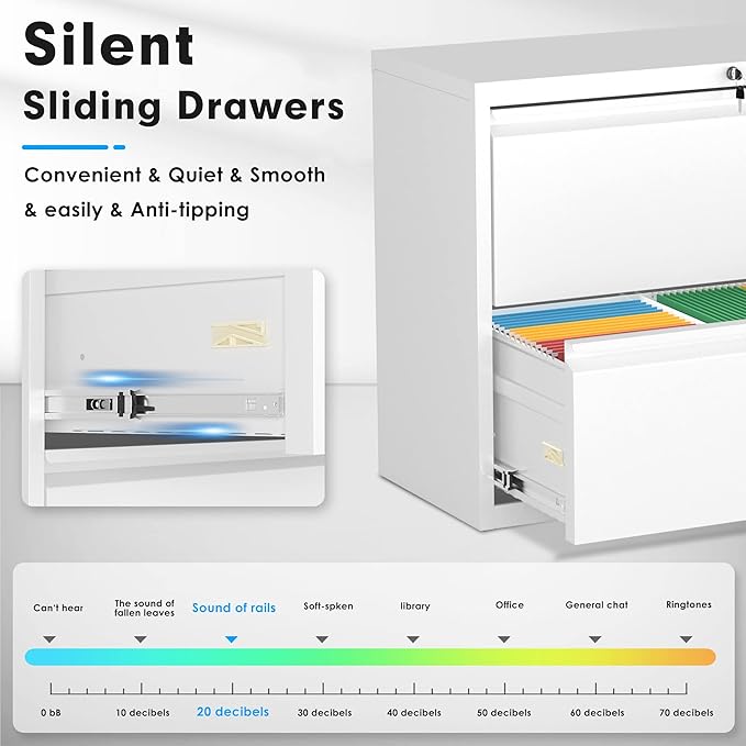 - ♚【Smooth & Silent Rails】Pataku 2 drawer white filing cabinets have smooth rolling bearing drawers, which make the sound of pulling the drawers less than 20 dB to maintain a quiet office atmosphere. The hanging rod in the drawer can effectively sort all kinds of files and keep them clean and tidy.