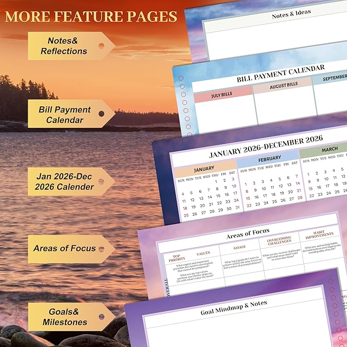 - Free Stickers & Premium Paper: Jan 2026-Dec 2026 planner comes with 2 pages of free stickers, ribbon bookmark to mark the pages you need to turn to immediately, a practical back pocket to keep loose cards or documents! The 100 GSM paper is good and thick enough that nothing bleeds through. And pretty and practical monthly Tabs help quickly find the month!