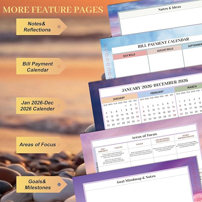 - Free Stickers & Premium Paper: Jan 2026-Dec 2026 planner comes with 2 pages of free stickers, ribbon bookmark to mark the pages you need to turn to immediately, a practical back pocket to keep loose cards or documents! The 100 GSM paper is good and thick enough that nothing bleeds through. And pretty and practical monthly Tabs help quickly find the month!