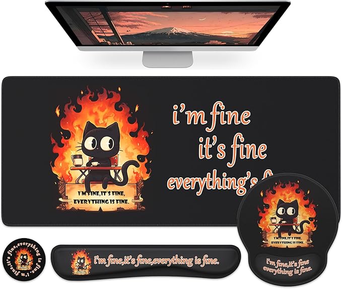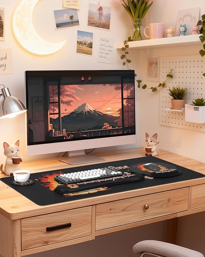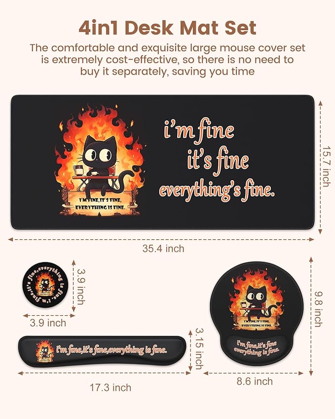 - Package Includes: desktop mat (35.4"×15.7"), ergonomic wrist rest (17.8" x 3.3"), mouse pad cute (9" x 10"), Coaster (3.5"). Our 4-in-1 Set will complete the look and feel of your desk