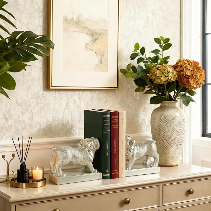 Decorative Bookends for Shelves, Dog Book Ends for Heavy Books, Bulldog Statues Bookends for Heavy Books with Anti-Slip Base Book Holders for Home Office Decor (Silver)