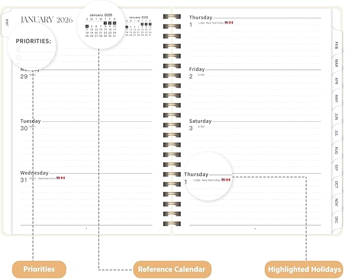 - [THOUGHTFUL DESIGN] - The agenda 2026 is equipped with a practical elastic band for closure, convenient monthly tabs for navigation, and a versatile double-sided pocket for storage. To motivate you, every month features an inspiring motivational quote.