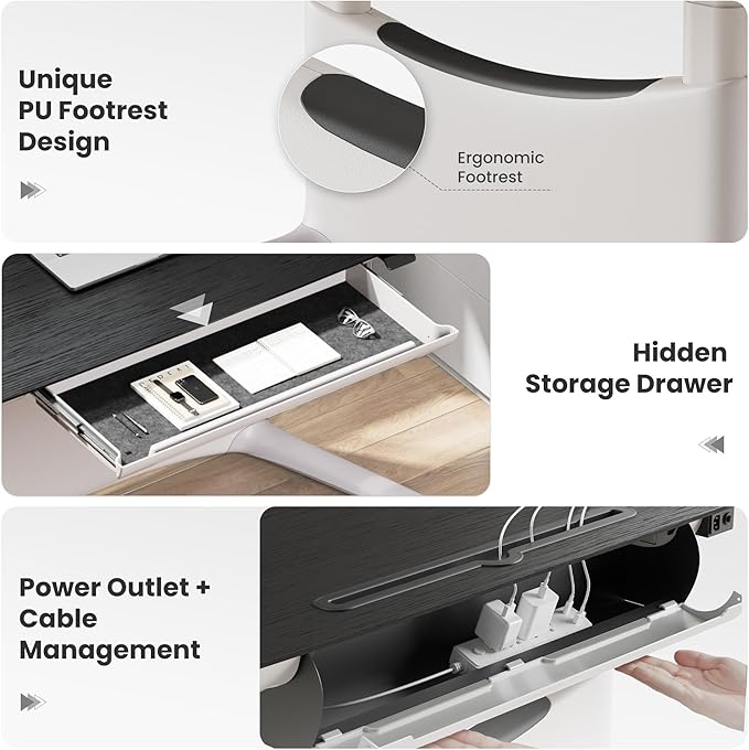 - Hidden Drawer & Organized Workspace: Unlike most standing desks, this one includes a large built-in drawer (25" wide) for easy storage of laptops, notebooks, and accessories. Combined with a rear cable tray + desktop grommet, it keeps your workstation clean, organized, and distraction-free.