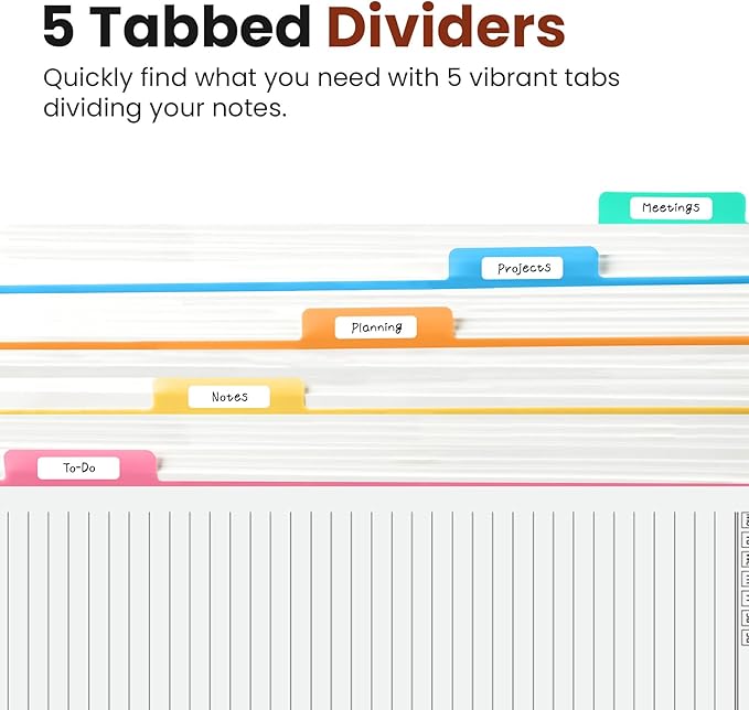 - 5 Subject Notebook with Dividers & Tabs: Stay organized with this 5 subject notebook, featuring 5 removable plastic dividers with tabs and 10 self-adhesive labels. These writable tabs make it easy to customize and categorize your notes for different subjects or projects—perfect for both school supplies and work planning.