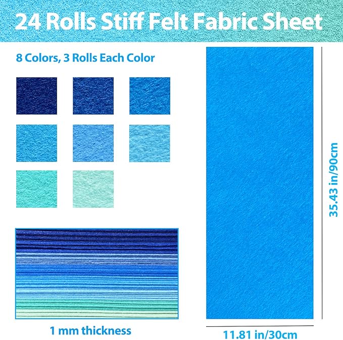24 Rolls 11.8 x 35.4 Inch Wool Blend Felt Sheets for Crafts, 8 Color 1mm Thickness Blue Teal Assorted Stiff Felt Rectangle Bulk for Sewing Patchwork School DIY Projects Decoration
