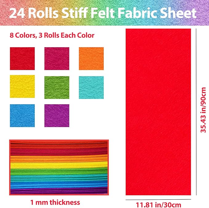 24 Rolls 11.8 x 35.4 Inch Wool Blend Felt Sheets for Crafts, 8 Color 1mm Thickness Rainbow Assorted Stiff Felt Rectangle Bulk for Sewing Patchwork School DIY Projects Decoration