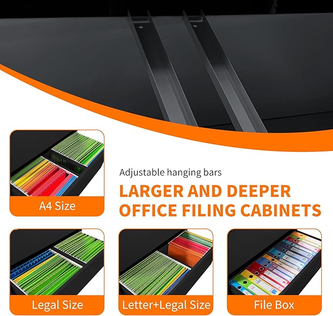 - 【Ample Storage Capacity】 The interior size of each drawer is H9.8"xW32.4"xD14". With four drawers and an adjustable hanging rail inside, it provides more than enough space to effortlessly hang Legal/Letter/A4 files or store your various belongings.