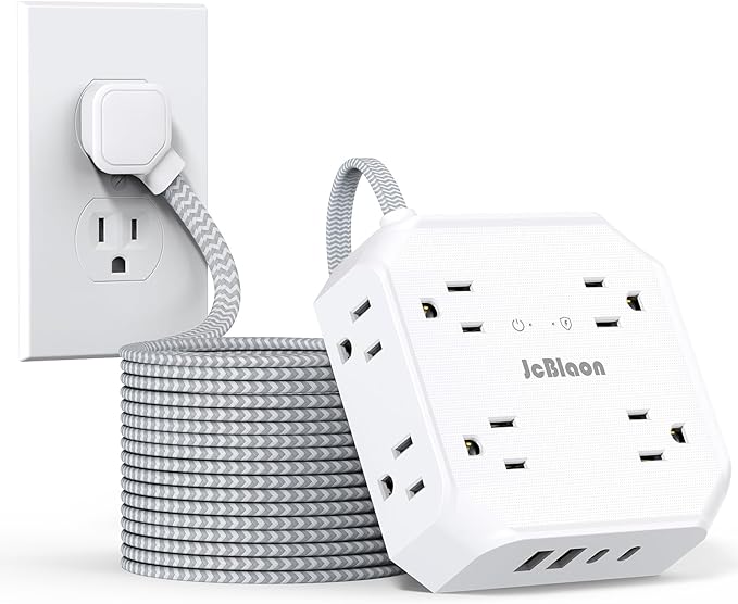 - 【12-in-1 Power Strip with USB Ports】JcBlaon 4-Side design surge protector power strip with 8 widely outlets 4 USB Charging ports, can power up to 12 devices simultaneously without a variety of converters. 2.2 inches widely spaced in between outlets, larger than standard socket, fit big adapters without blocking each other.
