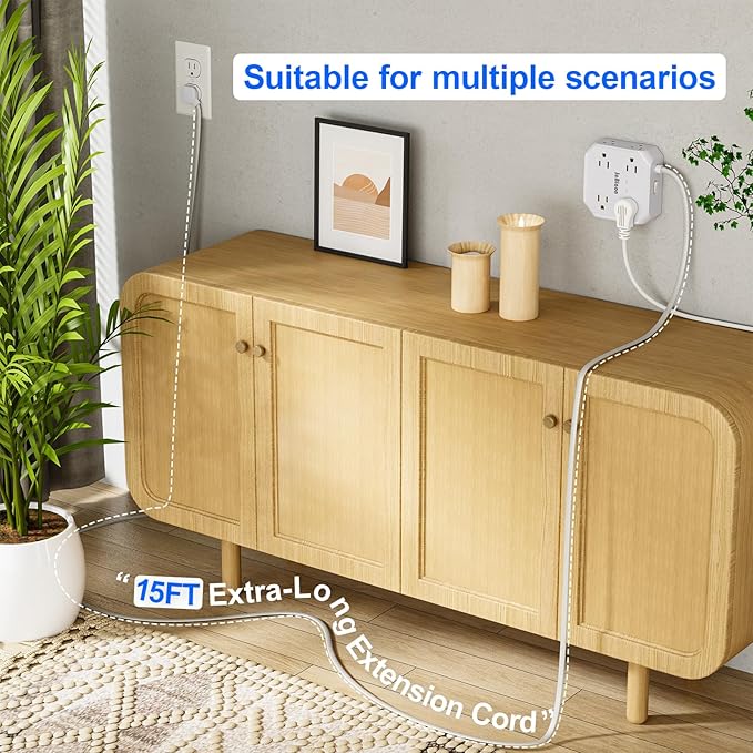 - 【15 Ft Long Extension Cord & surge protector power strip】The 15 Ft flat plug extension cord with multiple outlets, long enough to reach wall outlet Sockets, suitable for the home, office, and college dorm room essentials. With only 0.35 inch flat wall plug, this 15 ft power strip surge protector can infinitely close to the wall, hide in the back of furniture, such as sofa desk an so on to save you space. The 45° right angle low profile flat plug design keeps anther outlet free.