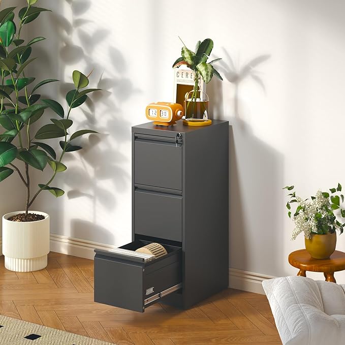 - 【SECURE LOCKING SYSTEM】This black 3 drawer filing cabinet comes with one security lock and 2 keys, securing all your files. You can lock all the drawers at the same time, ensuring confidential documents and valuables remain protected from unauthorized access.Engineered with an anti-tilting mechanism, this narrow file cabinet allows only one drawer open at a time.The interlocking system enhances stability.