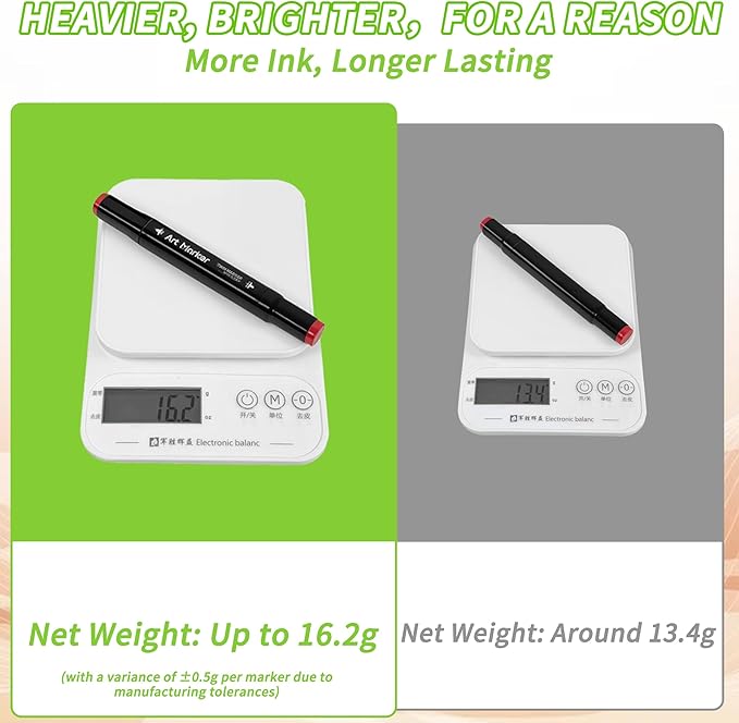 - 【High Quality 48 Color Markers Set】Our alcohol markers have vibrant black barrels, smooth ink flow, and vivid colors. Each weighs ~16.2g (±0.5g), 20% heavier than standard markers. Alcohol-based ink dries in 3 seconds to avoid smudges, blends seamlessly for smooth color transitions, and is non-odor & non-toxic. Larger ink capacity ensures long-term use.