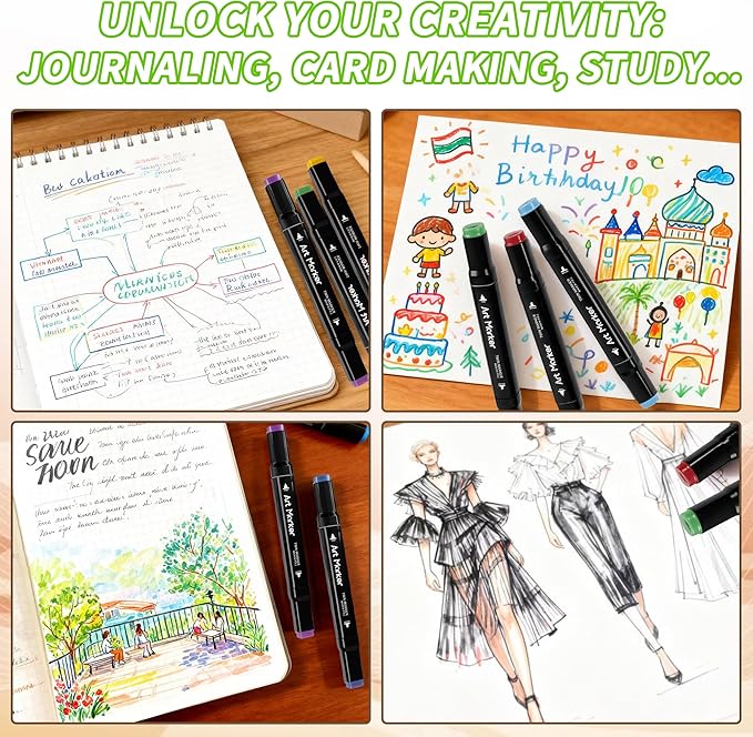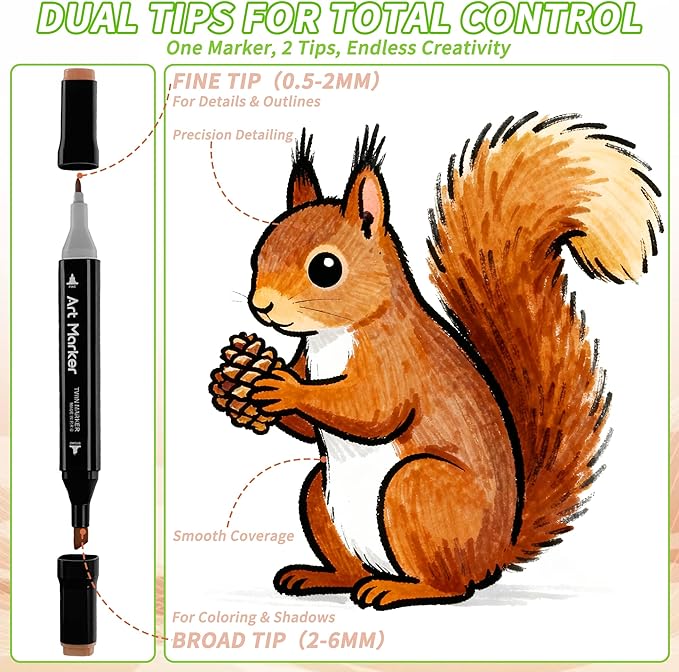 - 【Dual Tip Alcohol Markers For Versatile Creation】Features a 2mm fine tip (for student homework, detail drawing) and 3-6mm chisel tip (for adult coloring books, art projects)—easier to control than brush tips. Dual-tip design eliminates tool-switching, letting students smoothly sketch, shade, and fill, fitting class or family art time.