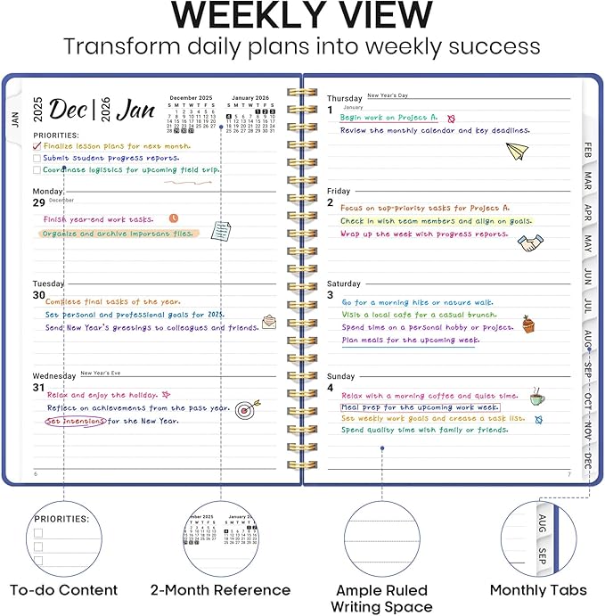 - Thoughtful Weekly Layout: Our planner features each two-page weekly spread, from Monday to Sunday, offering ample lined writing space. It also includes popular holidays, two-month reference previews, and a dedicated priorities area, making it easy to manage appointments, notes, and daily tasks.