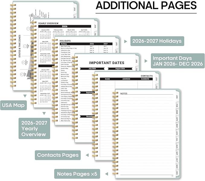 - Distinct Design: Built with strong spiral binding and a durable hardcover, this planner is made to last. It features dual storage pockets, a full 2026–2027 yearly overview, a U.S. map for quick reference, and additional lined note pages at the back—providing extra space for ideas, reflections, or important information. A perfect planner for women, men, teachers, and students alike.