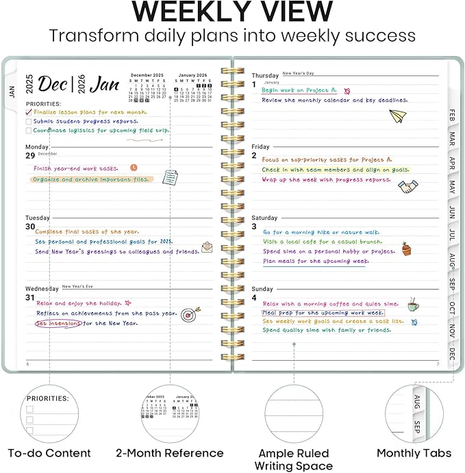 - Thoughtful Weekly Layout: Our planner features each two-page weekly spread, from Monday to Sunday, offering ample lined writing space. It also includes popular holidays, two-month reference previews, and a dedicated priorities area, making it easy to manage appointments, notes, and daily tasks.