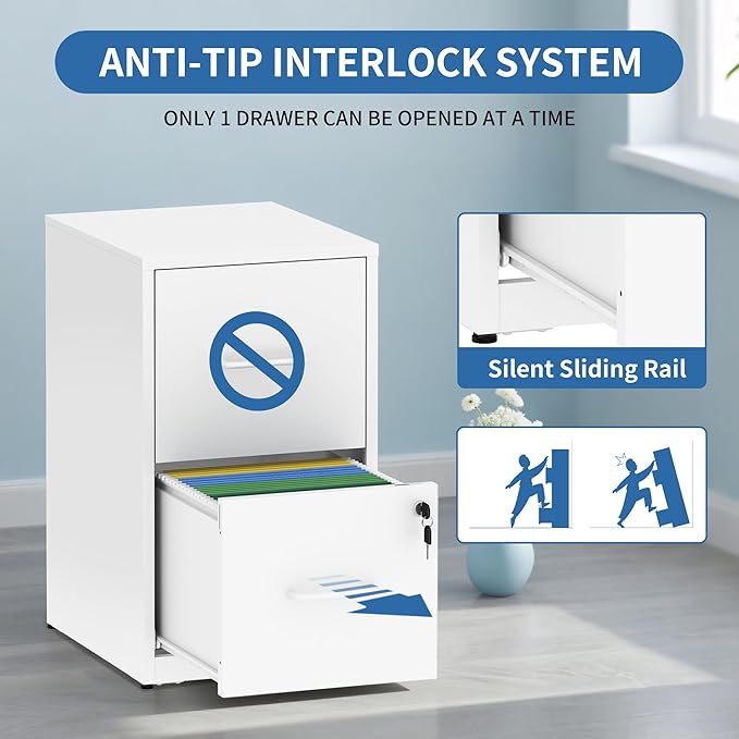 - 【HIGH SECURITY】This filing cabinets for home office with lock has one lock equipped with 2 keys securing all your files,you can lock all the drawers at the same time,with an anti-tilting mechanism, when one drawer of the narrow file cabinet is opened, the interlocking system prevents the other drawer from opening.