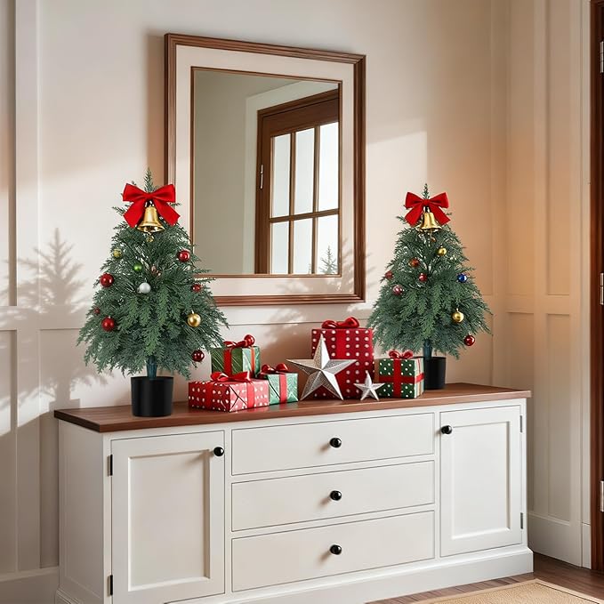 2Pack Artificial Topiary Trees, 2FT Faux Cypress, Faux Evergreen Pine Shrubs Plants with Pot, Potted Plants for Front Porch Indoor Outdoor Garden Christmas Decor