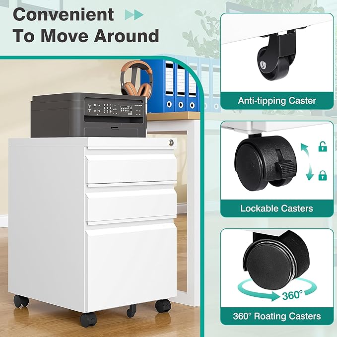 - ✔️【MOBILE DESIGN】: 3 drawer metal file cabinet with lock equipped with 360-degree rotating wheels and lockable casters for smooth mobility,one center caster to prevent tipping,perfect for under-desk storage or moving between workspaces