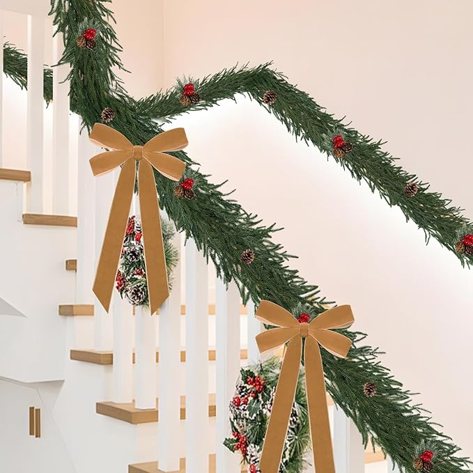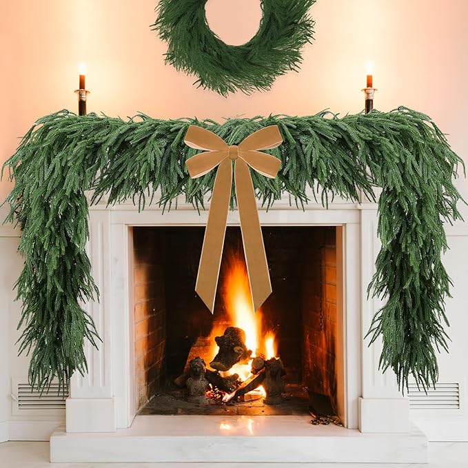 - 【What's Included】This set includes 2 pack 9ft Norfolk Pine Christmas garland and 1 velvet bow. The natural green color perfectly complements traditional Christmas decor, creating a warm and inviting atmosphere for your home
