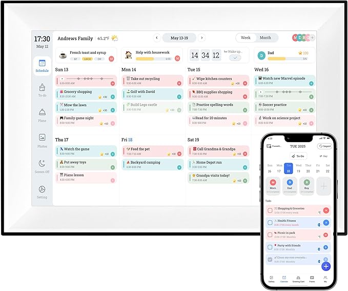 - [Digital Calendar Chore Chart & Meal Planning] Transform household responsibilities with our E-Chore Chart and Task Reward System that makes chores fun for kids. The integrated meal planner automatically generates grocery lists and weekly menus, answering the eternal "What's for dinner?" question. Color-code each family member's tasks for instant visual organization.