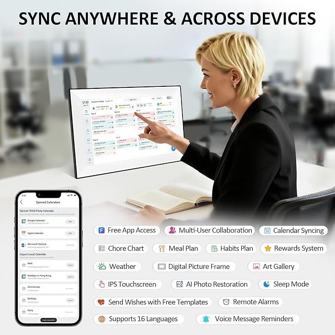 - [Effortless Setup & Smart Family Calendar Planner] Get organized in minutes with our plug-and-play system - just connect to WiFi and watch your calendars sync automatically. The free companion app lets you manage schedules from anywhere, while the multi-collaboration feature allows every family member to update events in real-time. Perfect for busy parents, students, and working professionals who need seamless coordination.