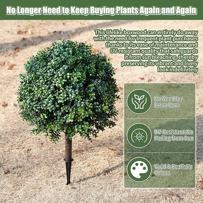 - 【UV Resistant Artificial Shrubs】High-density PE simulated leaves and a natural wood grain trunk, this 24'' tall Boxwood Christmas Trees features lifelike gradient green leaves. UV Resistant coating ensures that the colors remain vibrant and fade-resistant in both indoor and outdoor environments