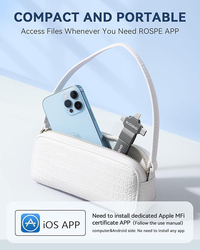 - 【MFi Certified iPhone Flash Drive – Wide Compatibility】This MFi certified photo stick for iPhone works smoothly with iOS devices (iOS 12.1 and above). Simply install the“ROSPE”app from the App Store to enjoy quick and secure backups. Perfect as a USB flash drive for iPhone and iPad, giving you reliable storage without the worry of data loss.