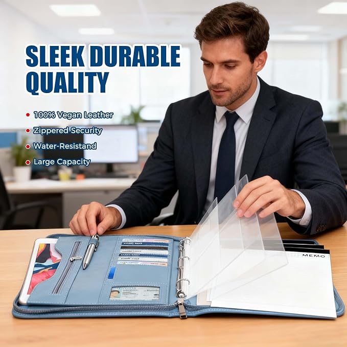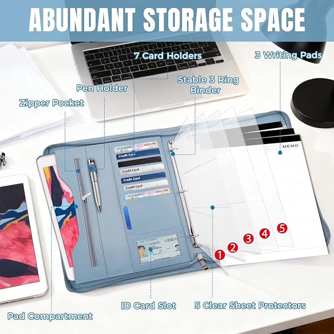 - LARGE CAPACITY:Multiple Functions Portfolio include with a Clipboard, a Tablet Sleeve,5 pages transparent binder pockets,several Document Pockets, a zippered pocket,7 Card Slots, and a Pencil Holder. Neat and Practical Organized All Your Stuff. This super business binder padfolio is big enough to safely store what you need yet is compact, stylish & travel-friendly.