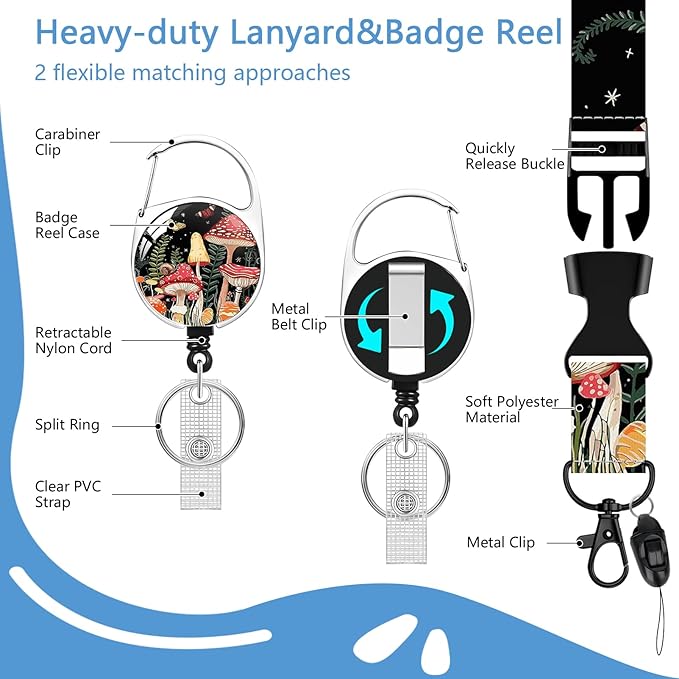Mushroom Badge Holder Reel Lanyard,ID Card Badge Holder Retractable Name Tag Clips for Doctor Nurse Teacher Office Student