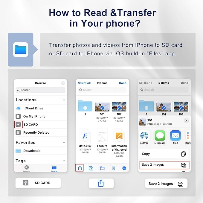- Plug-and-Play Convenience: No apps, drivers, or internet required! Simply connect the SD Card Reader for iPhone to your device and instantly transfer files. This user-friendly adapter delivers instant access to your data, making it perfect for on-the-go use.