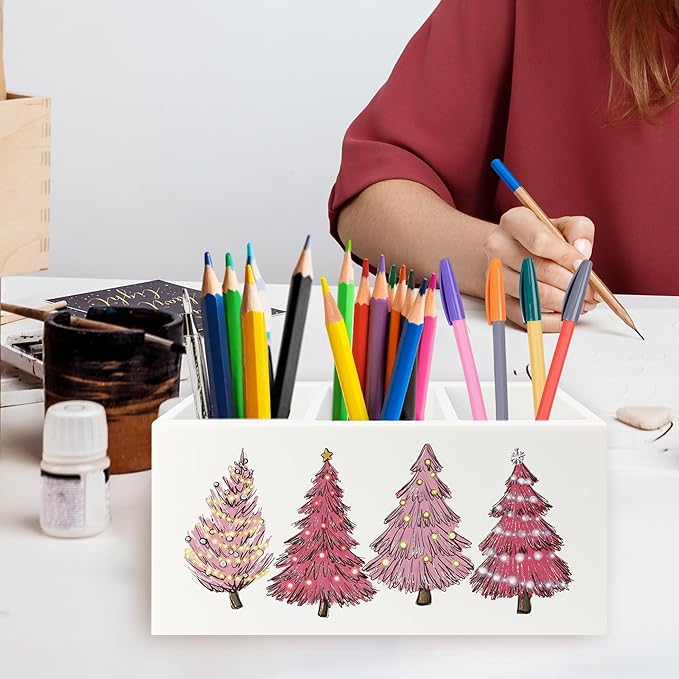 Pink Christmas Tree Pen Pencil Holder Organizer for Desk, Preppy Girly Xmas Holiday Wooden Box Signs Decorations for Girls Room Home Office Desk Tabletop, Girly Christmas Decor