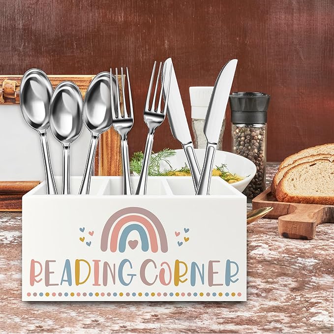 Boho Reading Corner Pen Pencil Holder Organizer for Desk, Boho Rainbow Bookish Wooden Box Signs Decorations for Reading Nook Corner Room Desk Tabletop, Book Lover Reader Gifts