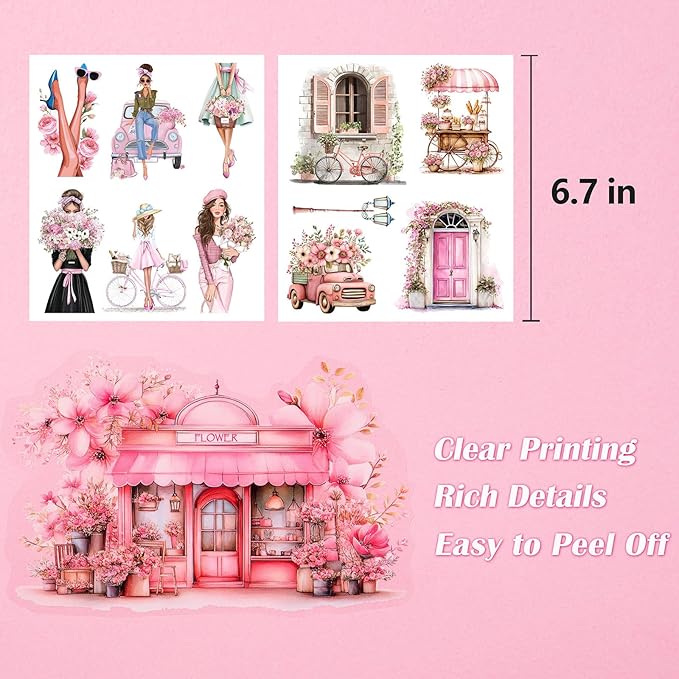 Paris Journaling Sticker Set, 18 Sheets PET Junk Journal Stickers, Pink French Theme Scrapbook Supplies, Transparent Watercolor Scrapbooking Materials, People Women Arts Craft