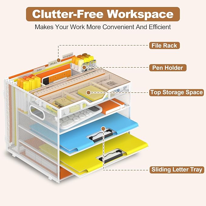 - Sturdy Metal Build and Back Hanging Function-Made of durable metal with a sleek powder-coated finish, this White 5-tier organizer resists wear for long-term use. It offers stability and a modern professional look, ideal as a desktop file organizer, file holder for desk and core file organizer for desk. The new Hanging File Organizer on the back serving as a hanging file folder organizer expands storage, a must-have for tidy workspaces