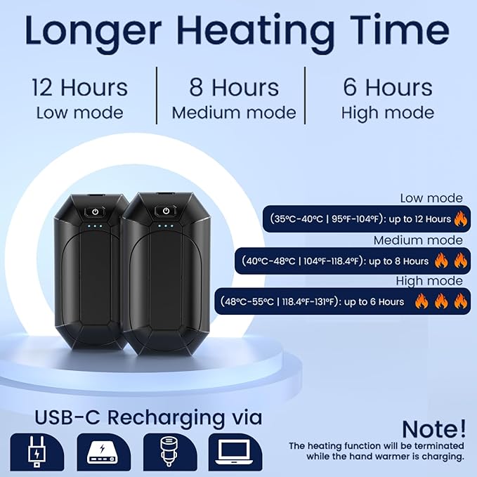 - Feel instant warmth in just 3 seconds! Choose from three precise heat levels to match your comfort. Perfect for managing circulation issues like Raynaud's or soothing arthritis pain in the cold. Enjoy up to 12 hours of gentle heat on Low, 8 hours on Medium, or powerful 6-hour warmth on High.