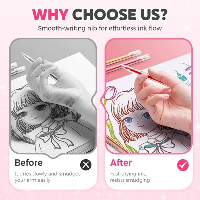 - SAFE FOR USE: All of the Gel Pens Acid-free and non-toxic ink doesnโt smear, fade, or skip. glitter gel pens for kids, colorful pens, markers pens for Adult Coloring Books, School Art Projects, Party Invites, Greeting Cards, DIY Decoration, Letters to Friends