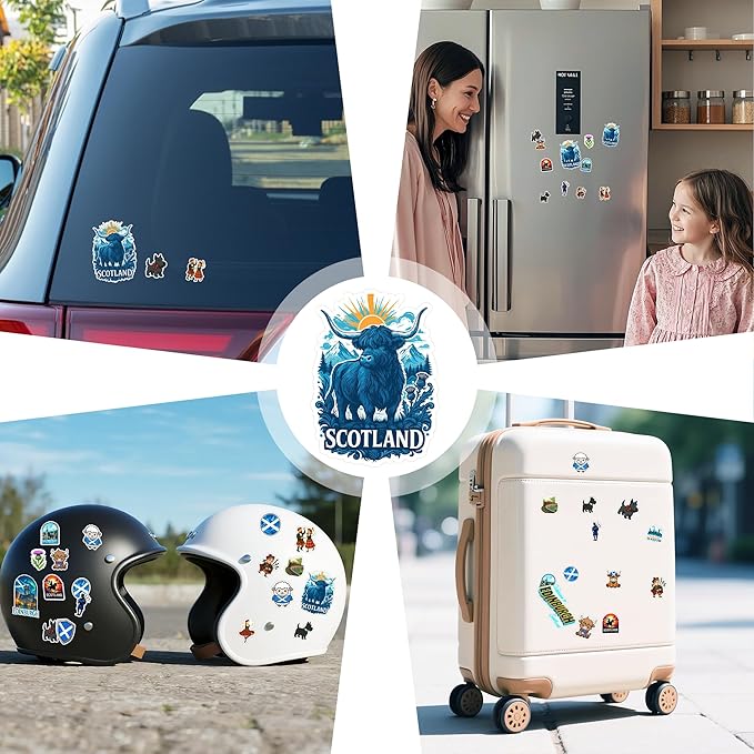- 100 PCS Scotland Sticker Collection – Includes landmarks, Scottish castles, thistles, bagpipes, highland cows, and city designs of Edinburgh, Glasgow, and the Highlands.